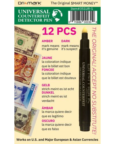 - INSTANTLY AND EASILY DETECT FAKE BILLS – Prevent profit loss with this fast, accurate, effective counterfeit tester; Marker pen detects genuine foreign currency paper; Simply draw a mark on a bill: dark mark means fake; light mark passes test; effective on Euro, British Pound, Australian Dollar, Hong Kong Dollar, Chinese Yuan, Mexican Peso, Japanese Yen, Us Dollar and more.