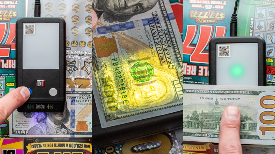 Dri Mark’s Flash Test Detector is the most innovative tool in our detection arsenal. With three innovative tests the Flash Test, tests the bill’s ink, watermark and security stripe. Being that it is the quickest and most discrete test, most people people only use the ink sensor test and then use the additional two tests if the bill fails the ink sensor test. The UV light on the Flash Test can also be used to expose UV features on state issued IDs and documents. Find out how to verify state issued IDs and credit cards HERE and get the latest information on genuine US currency HERE.